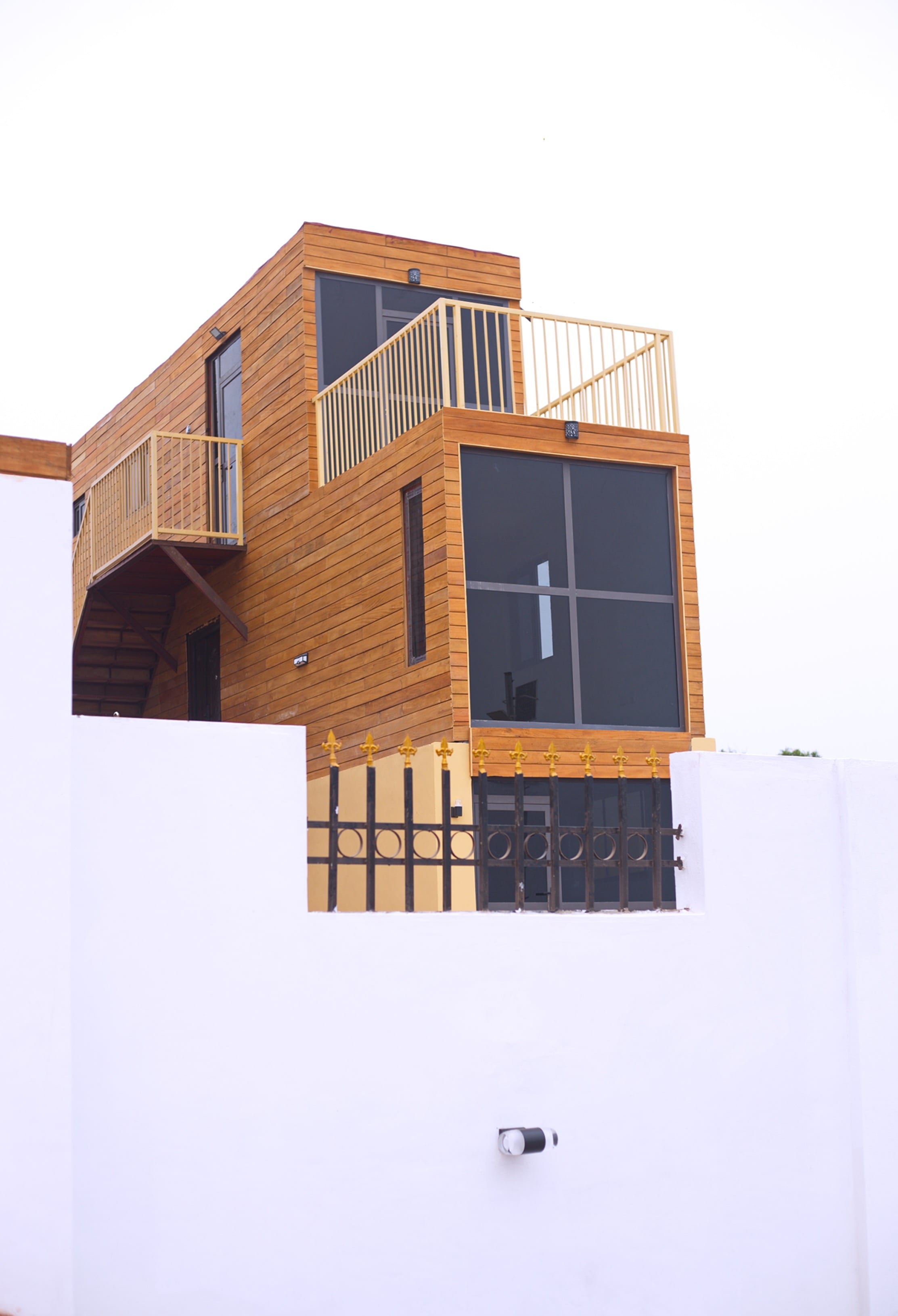 Multi-unit wood-clad residential compound — container-style construction with full interior finishing and bespoke joinery.